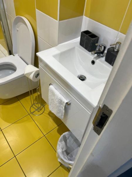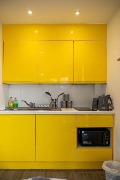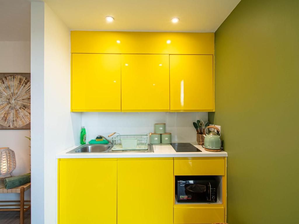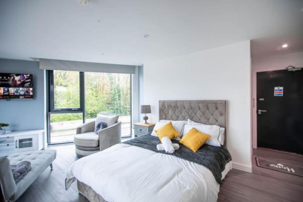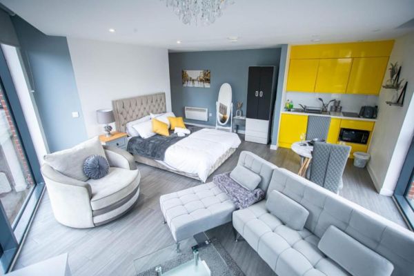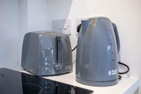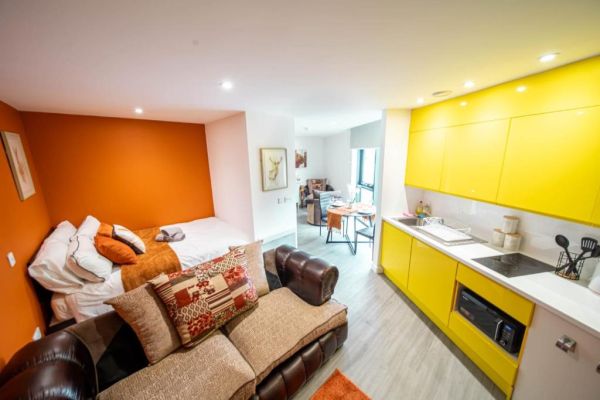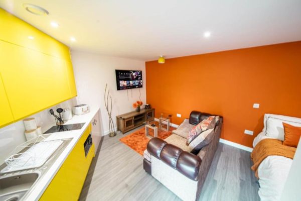 Comfortable Living Space: This lovely studio apartment in Sheffield features one bedroom and one bathroom, along with a spacious living room. It comes equipped with a kitchenette, dining table, sofa bed, refrigerator, seating area, shower, TV, sofa, electric kettle, kitchenware, wardrobe, toaster, and complimentary toiletries.